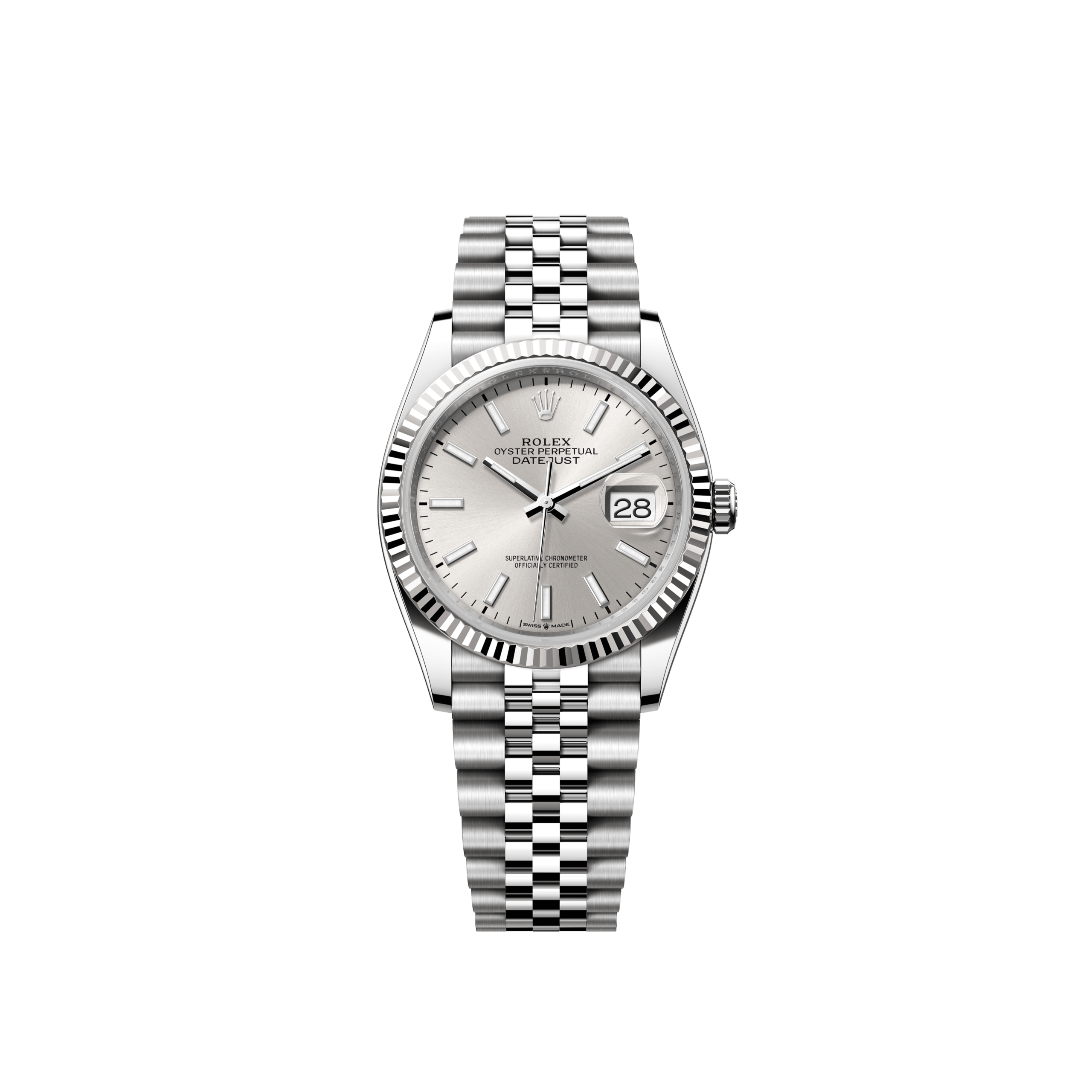 Die Rolex Datejust 36 126234 mit silbernem Zifferblatt strahlt zeitlose Eleganz aus. Das 36-mm-Oystersteel-Gehäuse wird durch eine geriffelte Lünette aus 18 Karat Weißgold akzentuiert, was der Uhr eine luxuriöse Note verleiht. Das silberne Zifferblatt unterstreicht den klassischen Look, während das Jubilé-Band aus Oystersteel für Komfort und Stil sorgt. Ausgestattet mit dem präzisen Rolex Kaliber 3235 bietet die Uhr eine Gangreserve von ca. 70 Stunden. Ideal für formelle und alltägliche Anlässe.